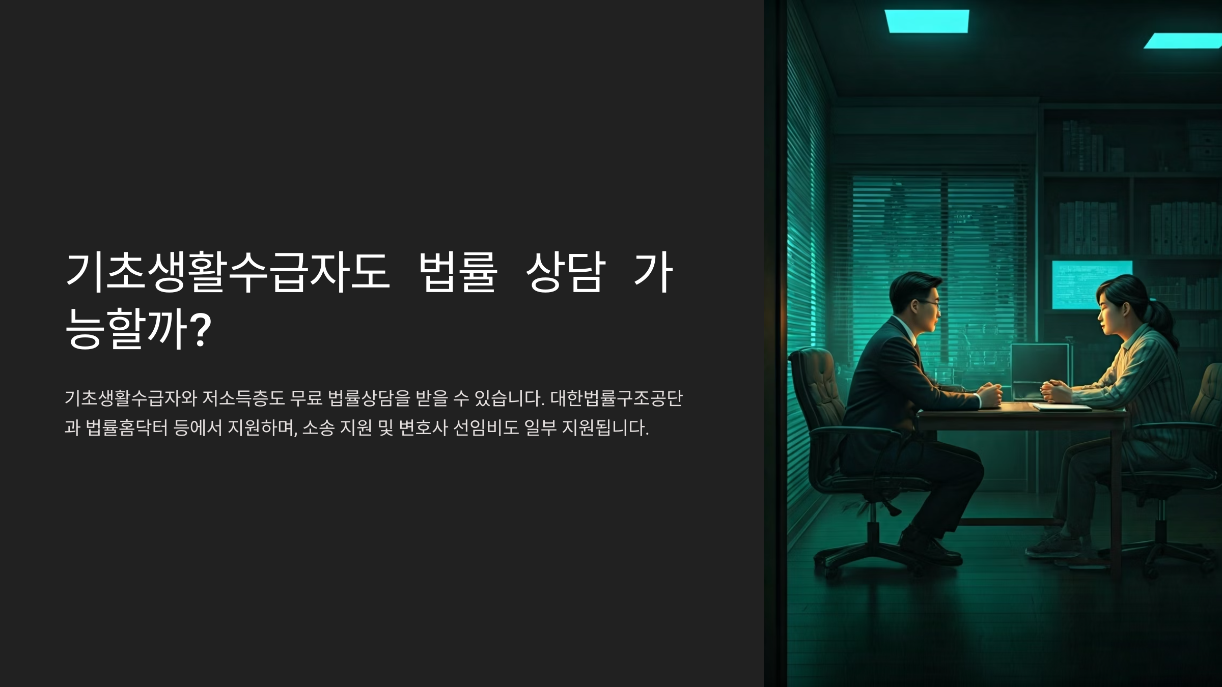 📋 목차⚖️ 기초생활수급자도 법률 상담 가능할까?📍 무료 법률 상담 기관 종류📝 상담 신청 방법💻 온라인·전화 상담 가능 여부📂 자주 상담되는 법률 사례💡 소송 지원 및 변호사 선임비 지원📊 법률상담 요약표❓ FAQ⚖️ 기초생활수급자도 법률 상담 가능할까?그럼요! 기초생활수급자는 ‘국가가 보장하는 최소한의 법적 도움’을 받을 권리가 있어요.법률 상담은 경제 상황과 상관없이 누구에게나 필요한 일이지만, 수급자는 특히 더 쉽게, 무료로 도움을 받을 수 있어요. 2025년 현재 수급자는 다양한 공공기관에서 무료 법률 상담 및 소송 지원까지 제공받을 수 있어요.특히 한국LegalAid공단, 대한법률구조공단, 지자체 법률홈닥터가 주요 기관이에요. ‘내가 이걸 써도 되는지’, ‘법적으로 위법인지 아닌지..